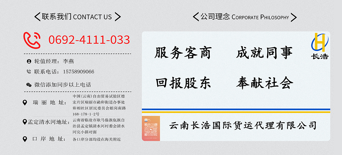 云南长浩国际货运代理有限公司由一支专业、经验丰富的团队创立,团队成员从事国际货运代理十余年,工作热情高、事业责任感强的团队持续输出精湛的业务能力,坚持以人为本的战略:服务客商、成就同事、回报股东、奉献社会,公司专注于中缅、中老进出口贸易服务,服务贯穿于整个国际贸易流程:专业进出口报关报检(含边民互市),中缅、中老陆运清关,退税代理,国际贸易结算,进出口单证办理,仓储,过境转关等一体化服务,瑞丽、畹町、弄岛、章凤、清水河、腾冲、南伞、打洛、磨憨、河口为主要服务口岸,公司弘扬遵守职业操守、精进利他、稳健操作的仁者精神,以诚相待、互惠互利为原则,聚焦客户需求,以更好的解决方案和服务持续创造商业价值和社会价值。